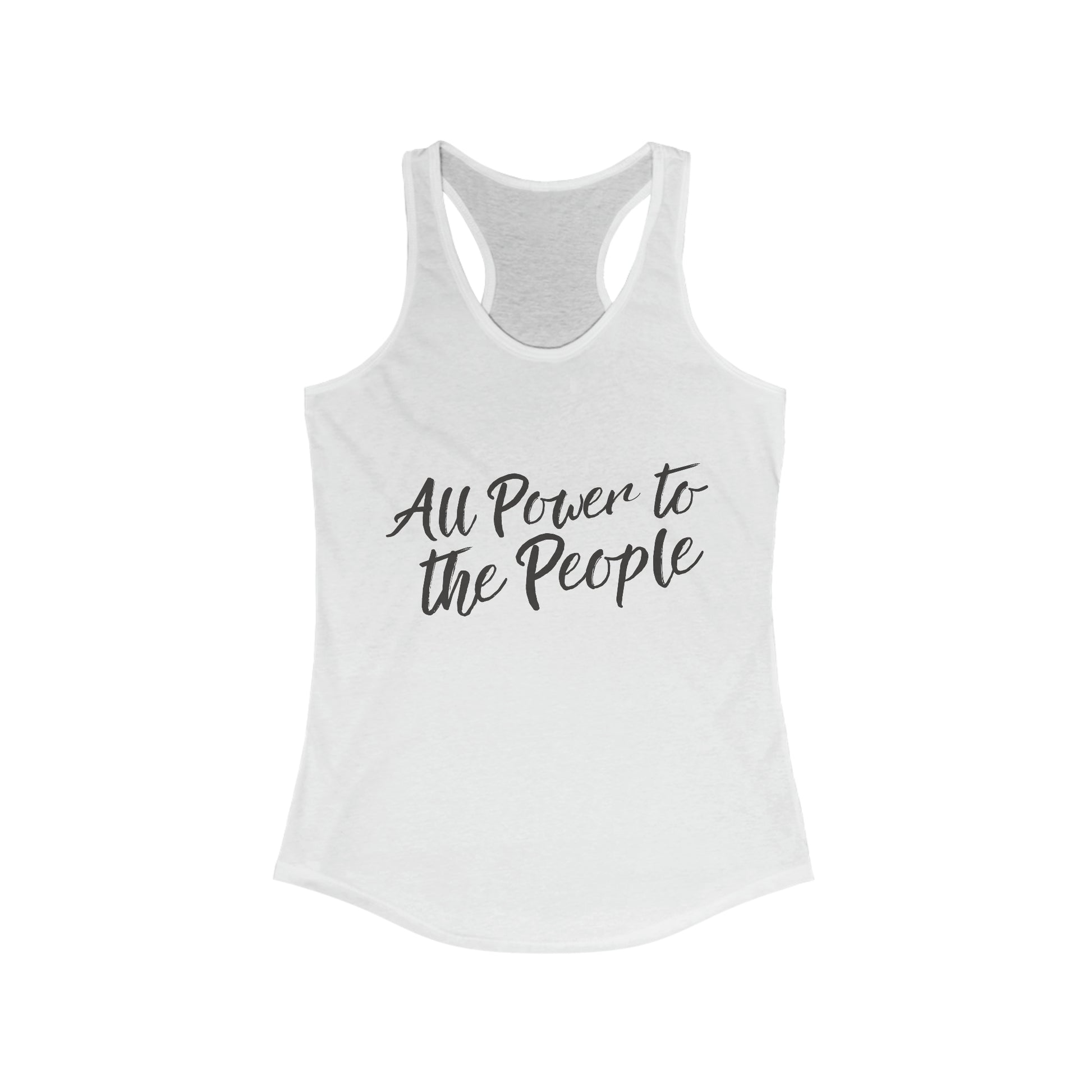 Unleash your inner activist with our empowering racerback tank top, featuring the captivating phrase "All Power to the People" in a bold brush font. This statement piece combines style, comfort, and a powerful message that demands attention.