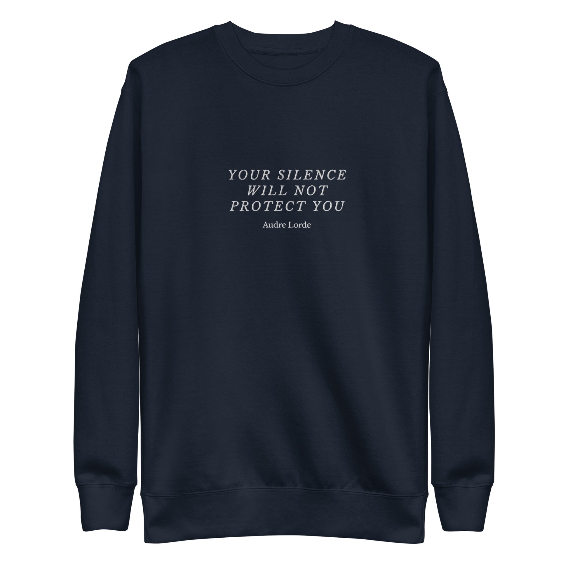 Step up your style game with our ultra-comfy "Your Silence Will Not Protect You" embroidered sweatshirt. Crafted from super soft fabric, it feels like a warm hug, keeping you cozy and confident all day long.